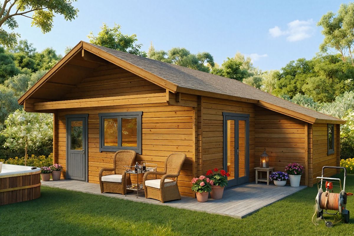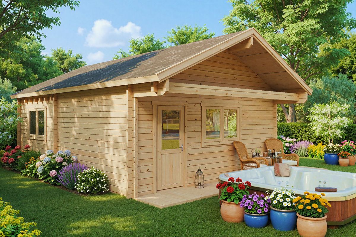 Das Holzhaus Dallas verfügt im 42 m² großen Erdgeschoss über zwei Schlafzimmer, ein geräumiges Badezimmer und einen Wohn- sowie Essbereich. Ein Schlafboden mit einer Größe von 5 × 3 m bietet zusätzlichen Platz zum Schlafen oder als Lagerfläche. Im Standard-Set sind 70 mm starke Wände, Türen und Fenster aus Sicherheitsglas und mit dem Kipp- und Drehsystem von Roto, Metall-Sturmleisten in allen vier Ecken, 28 mm starke Bodenbretter sowie 94 mm dicke, vorimprägnierte Fundamentbohlen enthalten. Um das Gartenhaus das ganze Jahr über nutzen zu können, empfehlen wir den Einbau eines Heizsystems und unser zusätzliches Isolationsset für Dach und Fußboden.